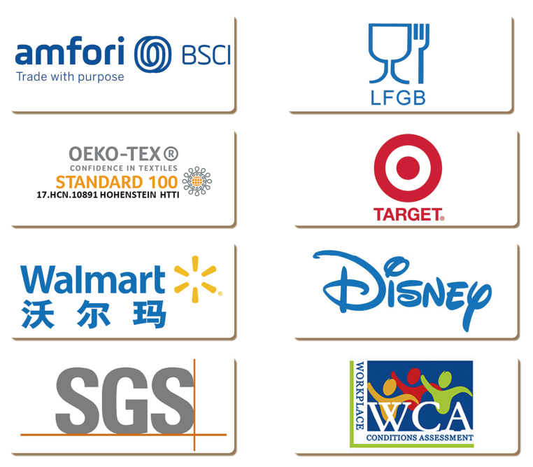 公司視產(chǎn)品質(zhì)量如生命,始終堅(jiān)持“以創(chuàng)新誠信求生存,以品種質(zhì)量謀發(fā)展”的質(zhì)量方針。公司先后通過ISO9001:2015質(zhì)量管理體系認(rèn)證、ISO14001:2015環(huán)境管理體系認(rèn)證和知識產(chǎn)權(quán)管理認(rèn)證;通過美國沃爾瑪驗(yàn)廠、迪士尼驗(yàn)廠、塔吉特驗(yàn)廠及歐盟BSCI認(rèn)證;產(chǎn)品通過歐洲Oeko-Tex standard 100生態(tài)紡織品1類(嬰幼兒)產(chǎn)品認(rèn)證、WCA、SQP認(rèn)證;產(chǎn)品通過SGS檢測及BV檢測,未發(fā)現(xiàn)增塑劑、雙酚A、福爾馬林等有害物質(zhì);有害重金屬及有害物質(zhì)符合歐盟EN 71玩具安全標(biāo)準(zhǔn),符合美國ASTM F963玩具標(biāo)準(zhǔn);產(chǎn)品材料符合德國LFGB食品接觸材料管理法、歐盟Reach法規(guī)、ROHS指令的相關(guān)環(huán)保標(biāo)準(zhǔn);抗靜電性能符合歐盟EN 1149抗靜電檢測標(biāo)準(zhǔn)。